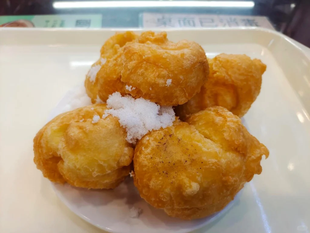 Golden and puffy, these fried  cakes crackle with a tender, milk‑scented dough inside. A dusting of  sugar adds a light sweetness—think a Chinese‑style doughnut that melts in your mouth.