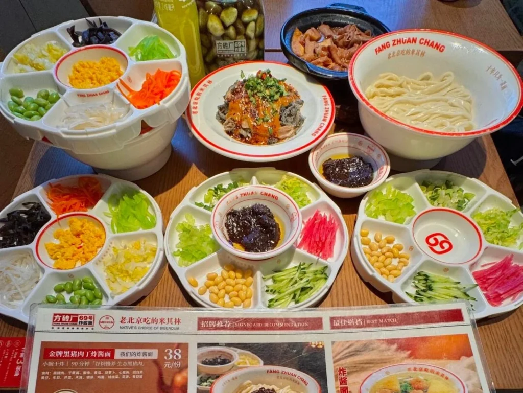 Zhajiangmian (fried sauce noodles) is pure home‑style nostalgia. Handmade noodles grab every bit of rich sauce made from yellow and sweet bean pastes, mixed slowly with diced pork. Topped with crisp cucumber, bean sprouts, radish ribbons, and peas, each colorful strand carries both savory depth and a hint of sweetness.
