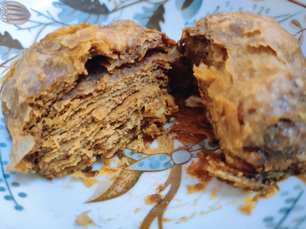 Shaped like old city gate studs, these golden pies hide a burst of savory juice inside. Bite through the crisp, flaky crust and hot lamb‑and‑beef filling drenched in meaty broth—just watch your tongue! Each pie packs deep, salty umami balanced by a tender exterior.