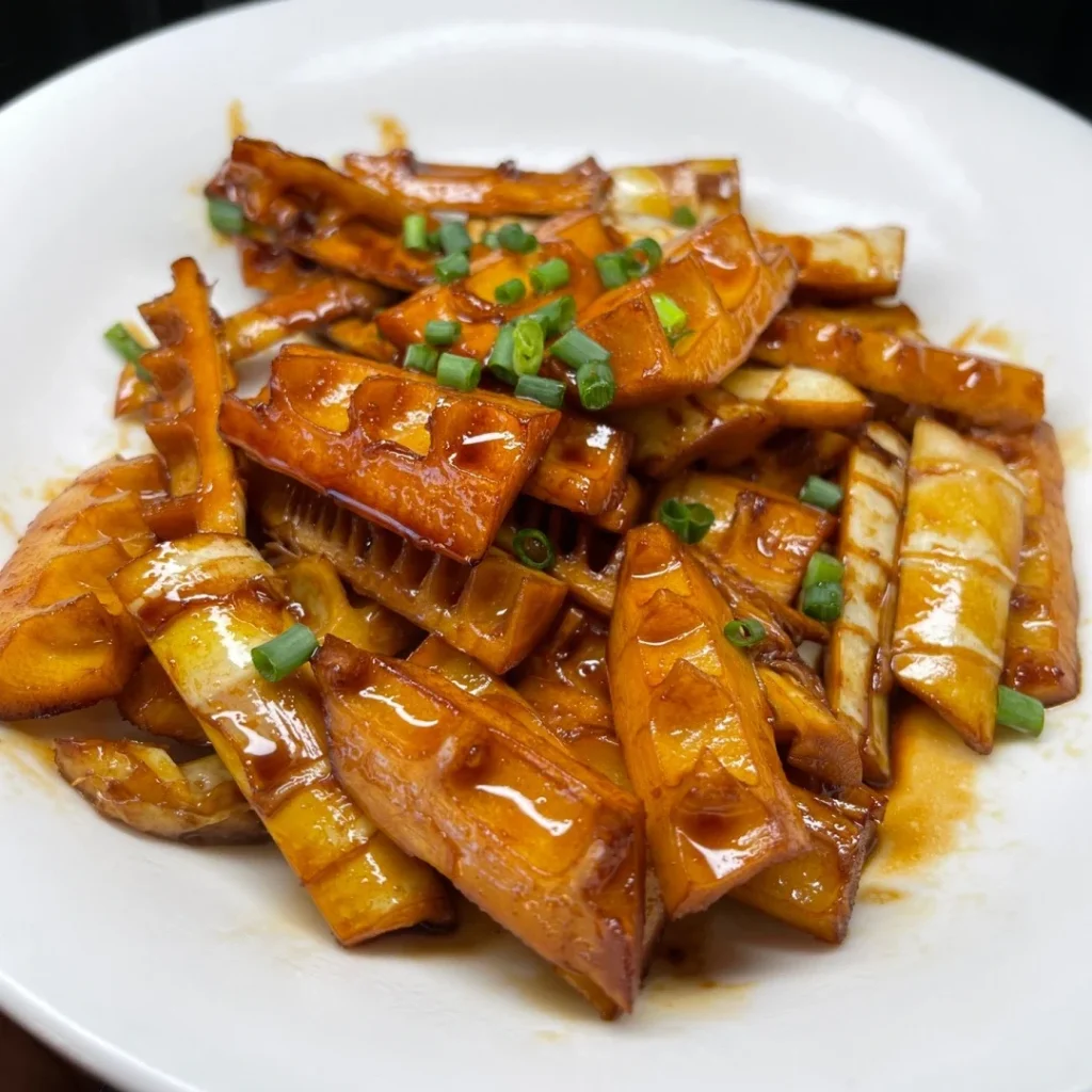 Fresh spring bamboo shoots braised in soy sauce, sugar, and fragrant spices.