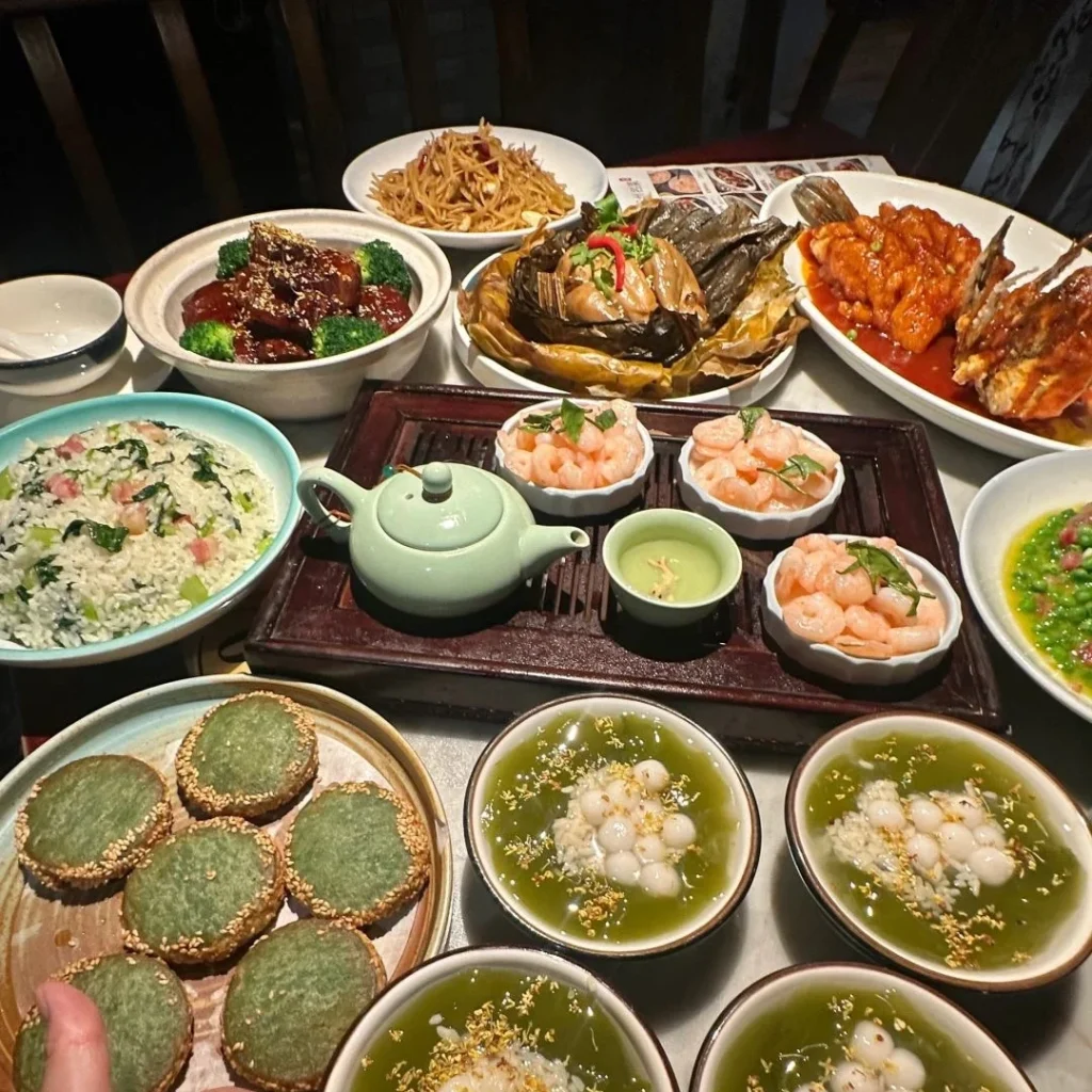 pork, and Longjing shrimp, highlighting fresh ingredients and rich flavors.