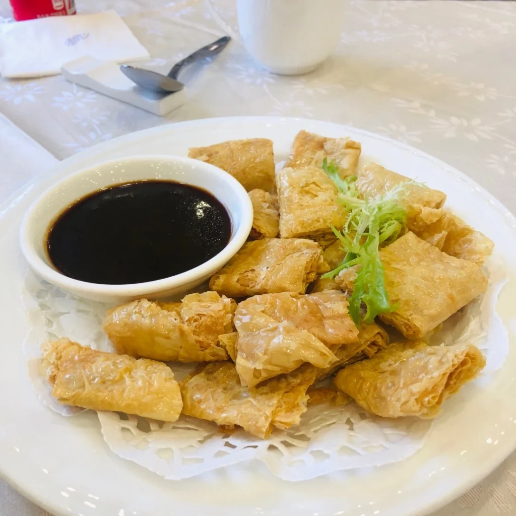 Thin, crispy tofu skin rolls filled with savory minced pork and vegetables.