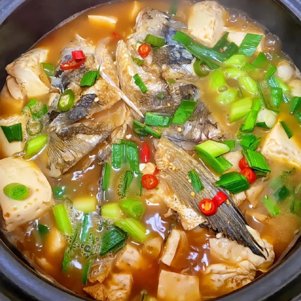 A comforting dish of tender fish head and silky tofu slow-cooked in a clay pot.