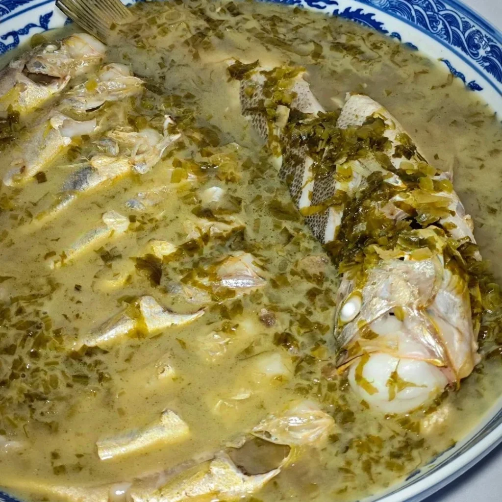 Fresh yellow croaker cooked in a flavorful broth with pickled greens.